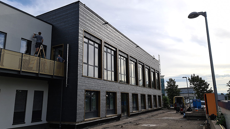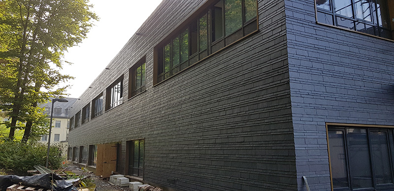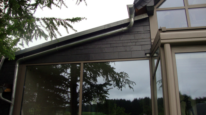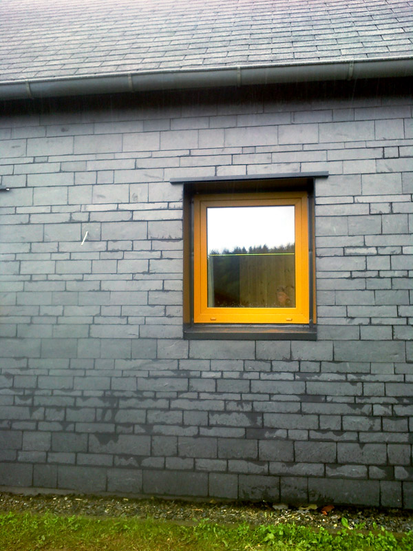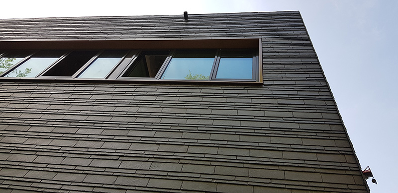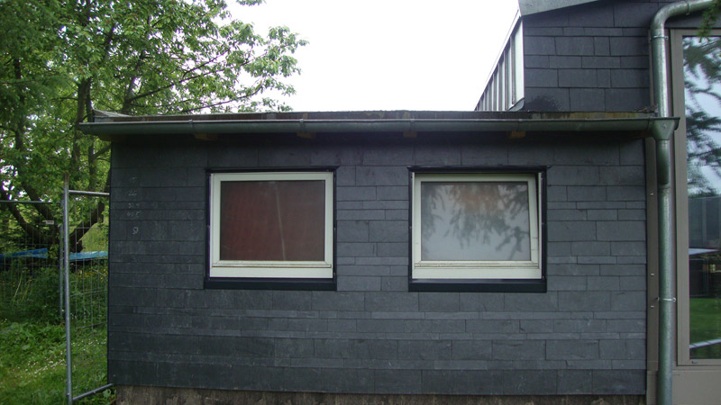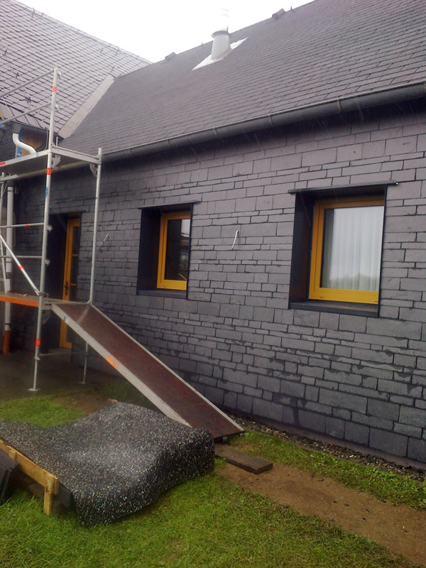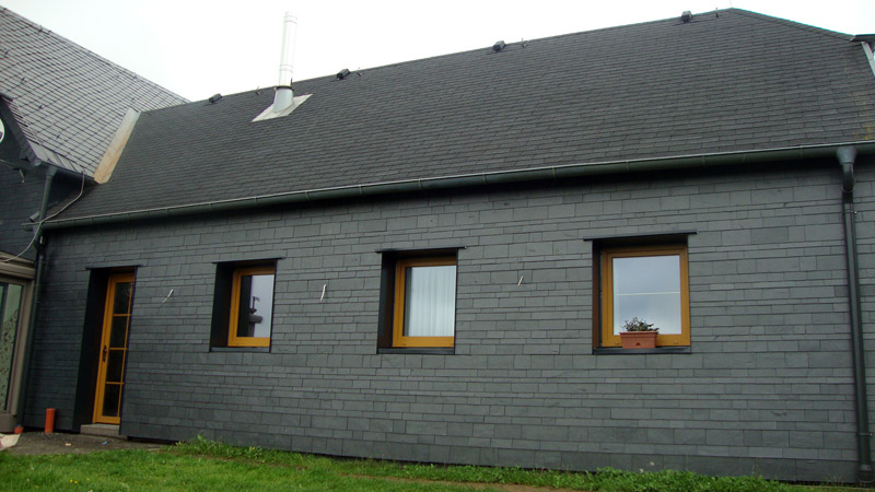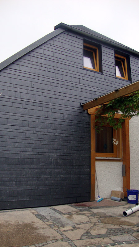 einer hinterlüfteten Schieferfasade mit verschiedenen Schiefergrößen.