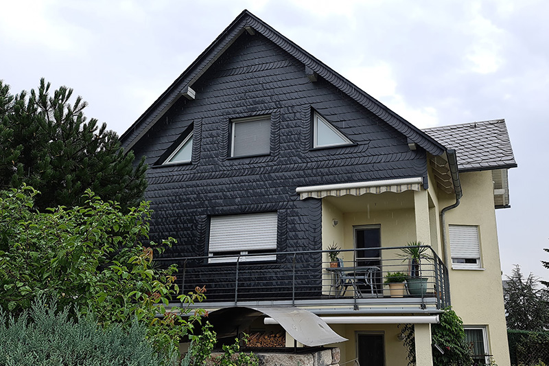 Wandschieferung als Schuppenschablonendeckung mit spanischem Schiefer an einem Wohnhaus.